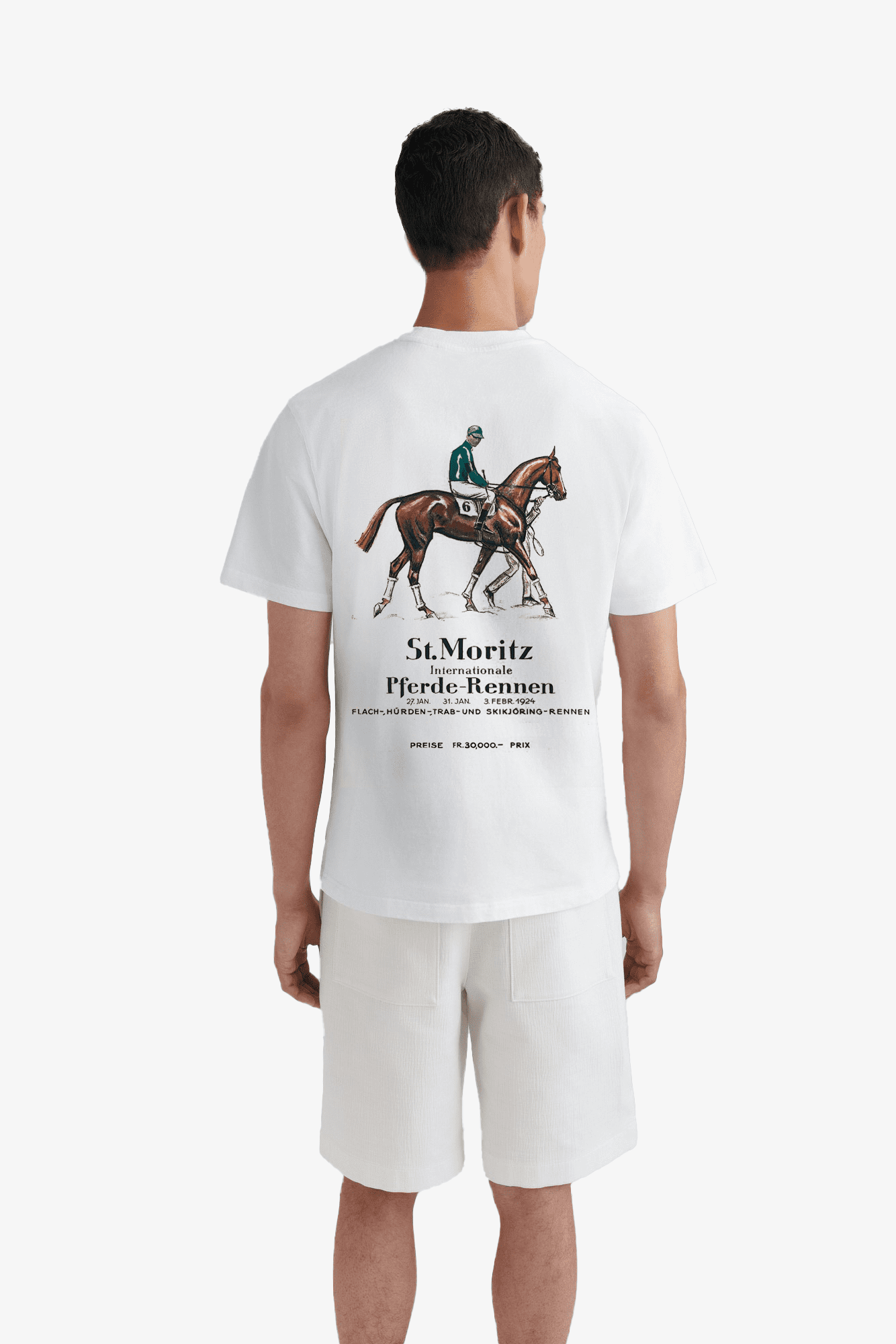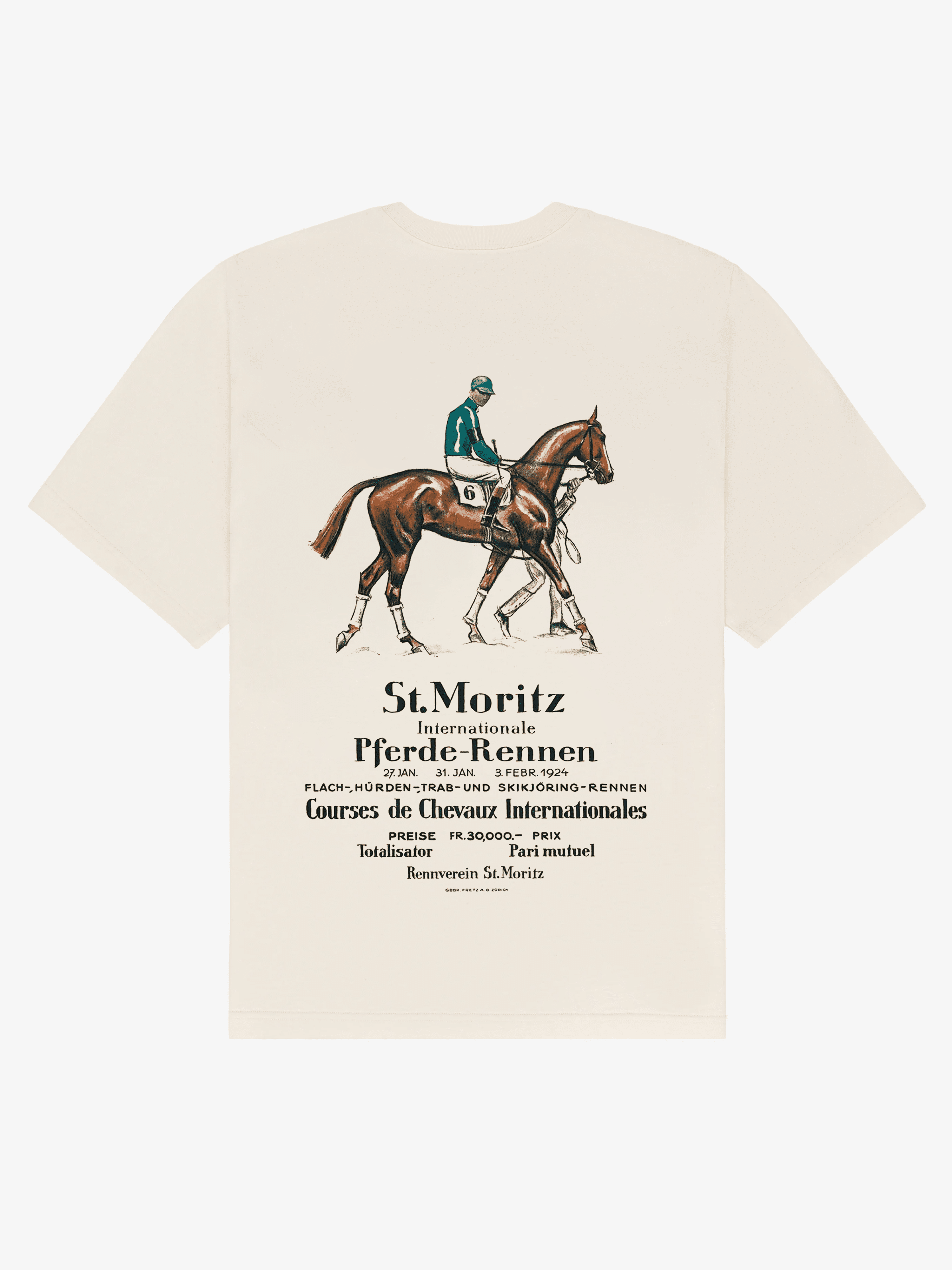 Stunning Vintage St Moritz Tee that refers to the ‘White Turf Day’ that happens each year now in St Moritz, where horses are raced on the snow. A classic head turning tee, avaliable in crisp white cotton or soft beige.